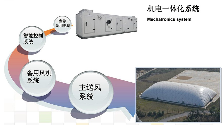 一般由圈梁基礎、膜體、充氣機械系統、控制與監控系統、電設計系統和進出口系統組成(空調與新風機選配)。
