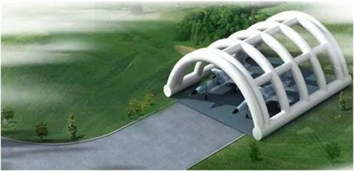 HangarH54Getafe充氣機庫)于2013年6月建造完成,工期為6個月。其凈寬為54m,凈長為110m,凈高為23m,管徑約為5m,實用面積為6000m2,允許容納2架大型飛機(如空客A310、空客A400M、波音707等)。從電腦或智能手機可以實時訪問壓力、風速、電機功率、能源消耗等相關參數。結構設計時,使用脊帶加強每根氣肋的剛度,從而顯著降低了膜面應力,使用肋帶、箍帶、豎向帶和交叉帶連接多根氣肋,從而實現了跨度大、承載性能高的目標。機庫前門采用可移動的充氣圓柱組合而成。