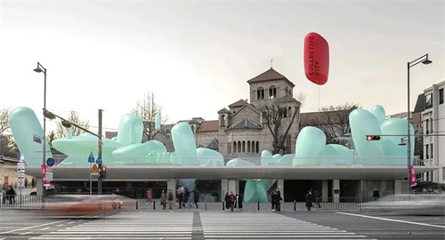 2002年瑞士博覽會(huì)在蘇黎世Neuchatel建造的名為藝術(shù)海灘(Arteplage)展館,三個(gè)一致的氣囊膜,直徑約為100.0m圓形碟狀,上翹外襯邊為骨架式膜,36根柱支承,是迄今最大的一組氣囊膜建筑。