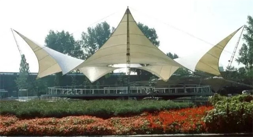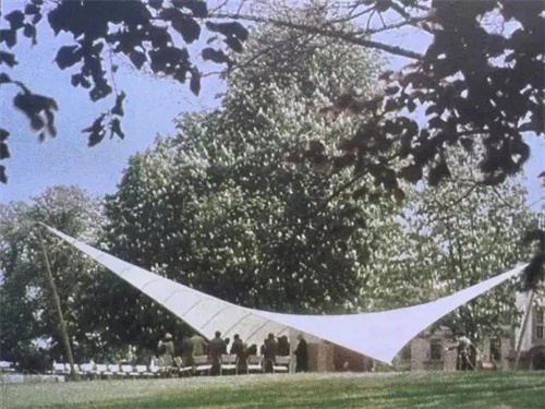 奧托1955年設計卡塞爾聯邦花園展覽音樂廳像是一個四點支撐的帳篷依靠邊索給膜施加預應力使帳篷的外形呈現兩頭向上、兩頭向下的形狀(馬鞍形)這個設計宣告了帳篷設計進入了全新的時代。