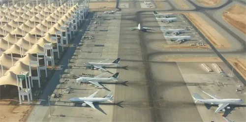 沙特吉達國際機場的Hajj航站樓(朝覲航站樓)是全球穆斯林朝覲者前往麥加的重要交通樞紐,航站樓采用獨特的膜結構帳篷屋頂,由特氟隆涂層玻璃纖維織物制成,可反射76%的太陽輻射,即使在高溫環境下也能保持室內涼爽。是世界上最早也是最大的張拉膜結構之一。由210頂巨大的錐形膜結構單元組成,猶如一群沙漠中的帳篷,既體現了當地文化傳統,又完美解決了大跨度遮陽問題。