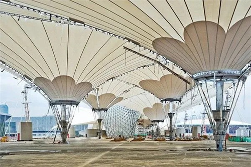 2010年上海世博會主入口的世博軸也采用了張拉索膜結構由德國SBA公司和華東建筑設計研究院設計全長1045米、寬約100米的世博軸由6個喇叭形的“陽光谷、13根大型桅桿數十根斜拉索和巨大的膜結構組成。
