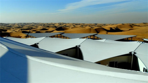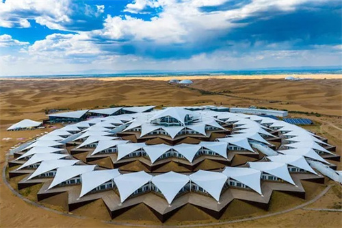 膜結構以“蓮花”為靈感,通過層層張拉膜模擬蓮花的形態,既呼應沙漠中沙丘的曲線,又形成獨特的視覺景觀。這種設計不僅美觀,還充分考慮了沙漠環境中的日照、風沙等因素,實現了功能與形式的統一。采用輕鋼結構作為支撐,搭配高強度膜材,既減輕了建筑自重,又通過特定的鋼板固定流沙,形成類似“沙海浮舟”的獨特地基基礎,確保在沙漠環境中保持穩定。