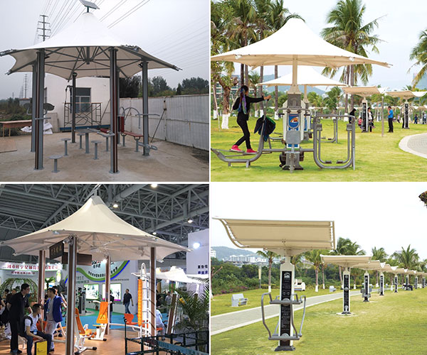 為打造戶外小型健身房,將單一功能的健身器材安裝在一個膜結構亭子內,形式獨特,新穎,讓人眼前一亮,真正作到了與大自然融為一體,體育配套膜結構亭子既發揮了健身器材強身健體的本意又起到了檔雨遮陽的作用。